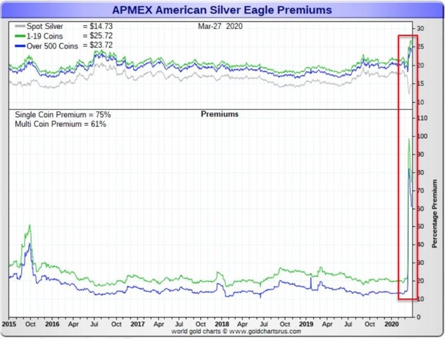 As we have detailed previously, even though there’s literally thousands of tons of gold bars sitting in vaults around the world, it’s been hard to get metal when and where it’s needed, and so premiums for physical bullion is extreme to say the least.
