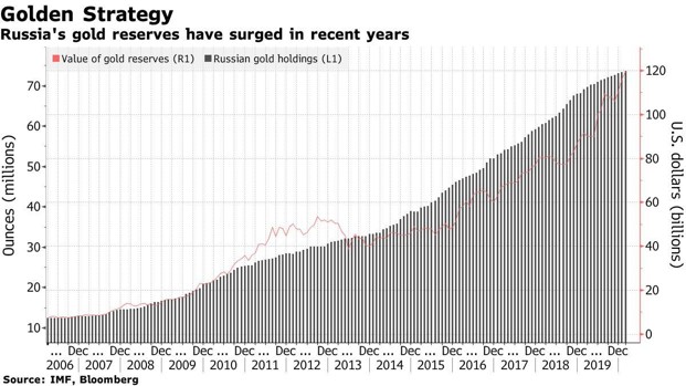 The bullion stockpile held by Russia’s central bank is valued at about $120 billion.