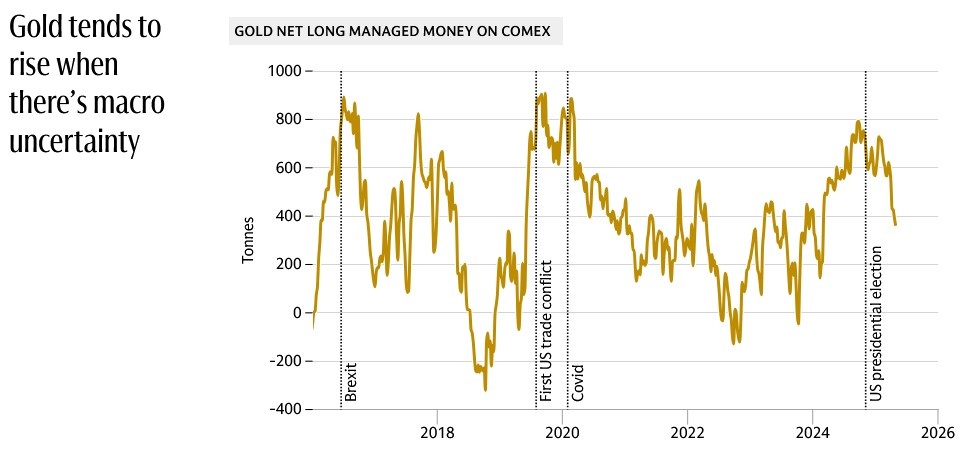 Source: CFTC, Goldman Sachs ResearchA snapshot of how hedge funds and other traders are positioned shows that gold trading spikes during periods of geopolitical turmoil. Gold has risen in 2025 amid uncertainty over the Trump administration’s tariffs on major trading partners.