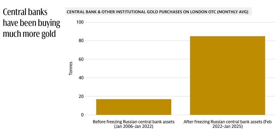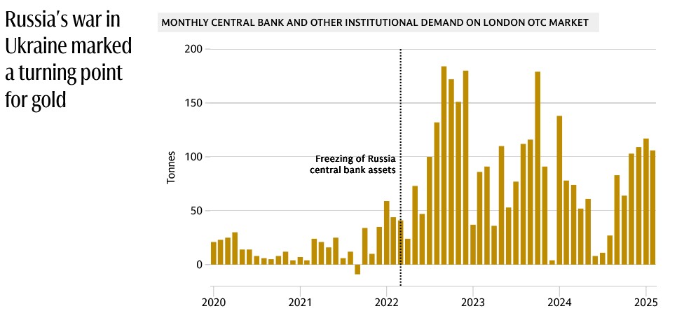 The freezing of Russian assets in Brussels showed that foreign reserves could potentially be confiscated. As a result, governments have been buying much more gold.