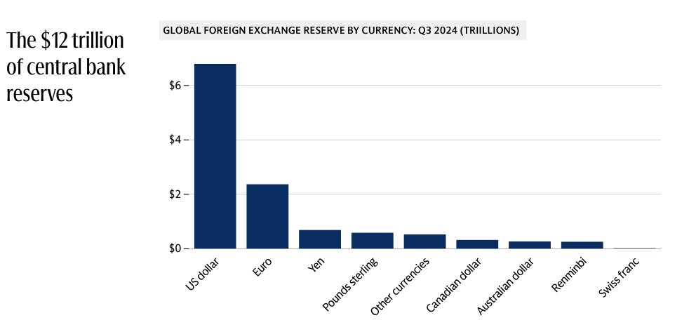 Central banks hold more than $12 trillion in foreign exchange reserves. They keep these assets for a number of reasons, such as diversification, to protect against inflation, and to defend their own currency if it comes under stress (by selling foreign reserves to buy the domestic currency). Foreign reserves are often denominated in the US dollar but also other currencies like the euro.