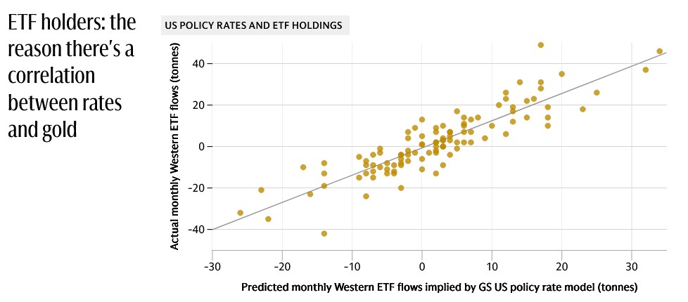Source: Goldman Sachs Research, Federal Reserve Board. As of March 25, 2025.ETFs linked to gold have about $294 billion of assets under management, representing about 3,000 tonnes of the material. The likes of pensions and individual retail investors tend to hold the bulk of investments in gold ETFs. ETF holdings typically track interest rates closely.