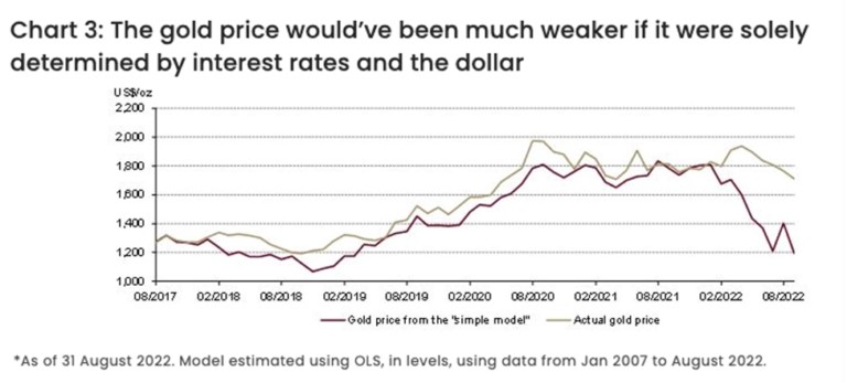 - Based solely on interest rates and dollar strength, gold should have fallen about 30%, according to a WGC model.