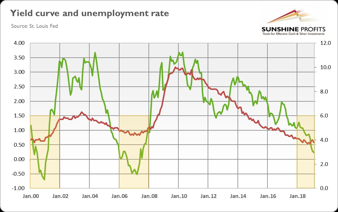 To make a long story short, we are still not freaked out by the yield curve inversion and we urge gold investors to keep calm. Why? The key world is “macroeconomic context”. Let’s take a look at the chart below. It displays the yield curve and the unemployment rate, which is one of the most important macroeconomic gauges and recession indicators.