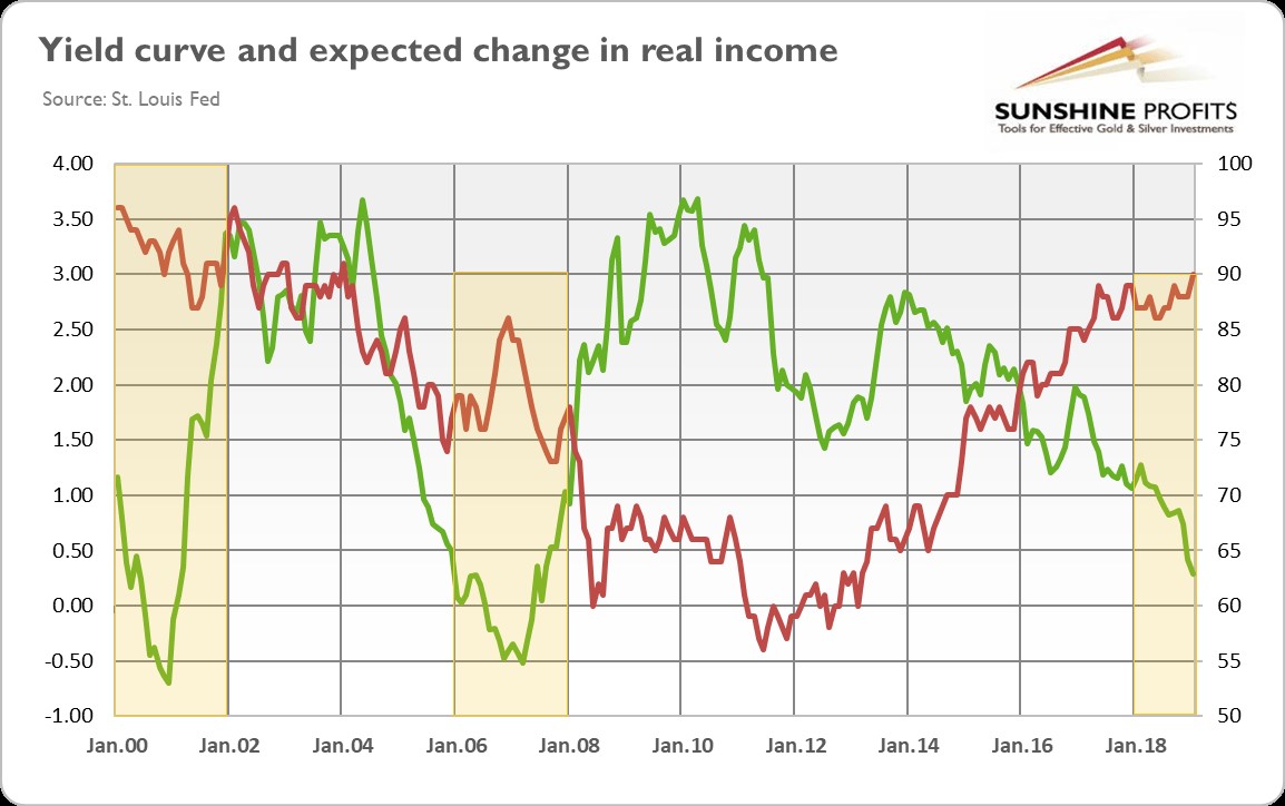 As one can clearly see, in two previous cases of the yield curve inversion, the unemployment rate was either flat or rising. But now, the unemployment rate does not send any evident recessionary signals which would make the gold bulls instantly happy. We can cite much more data that shows how the current condition of the American economy differs from the previous yield curve reversal. Actually, we have already done so in the March edition of the Market Overview. Here, we will present just one more chart, which shows the yield curve and the expected change in real income of households as calculated by the University of Michigan.
