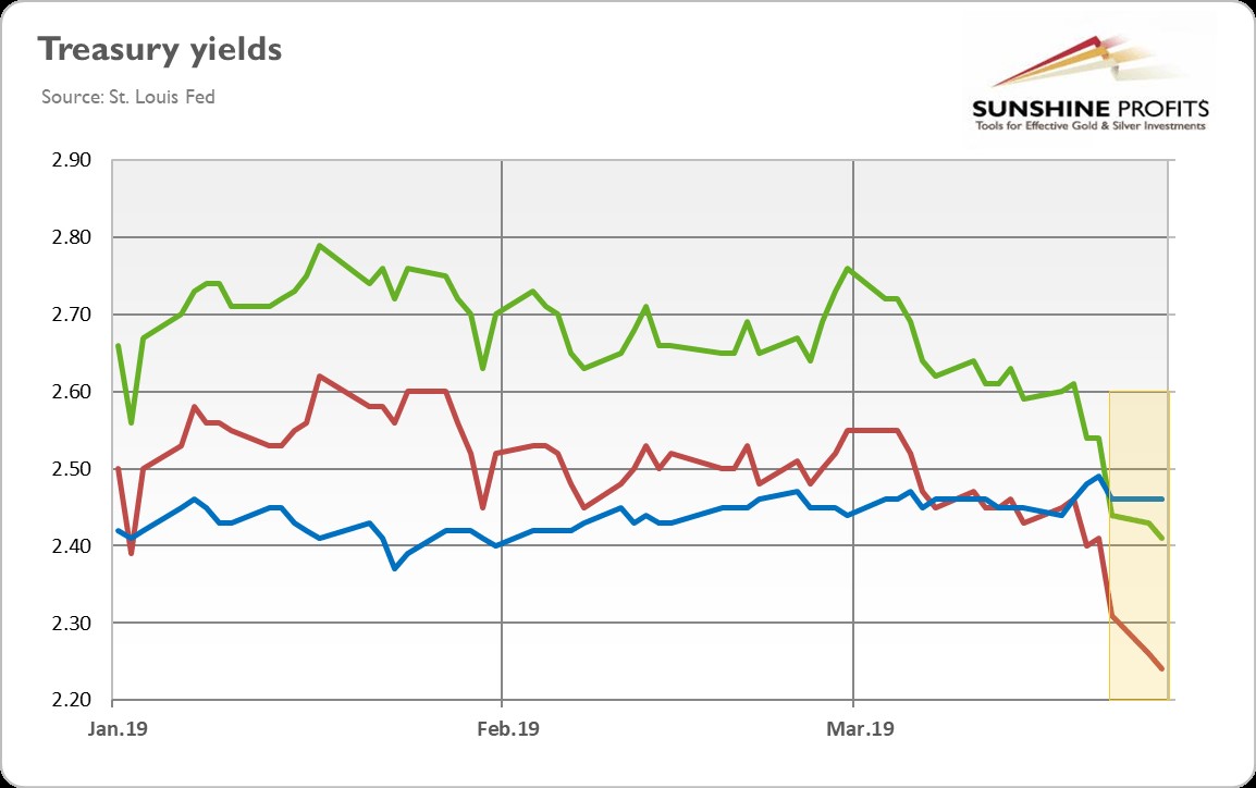 So, investors became more pessimistic. But, does it matter at all? After all, the current expansion is already the most hated expansion after the WWII. Last but not least, the chart above also indicates that the 10-year yields are still higher than 2-year rates, so only one type of spread has inverted so far (in contrast to previous pre-recessionary inversions). All this leads us to the conclusion that the fresh yield curve inversion does not necessarily signal the imminent recession (and if it does we still have about 12-18 months before it will arrive). Hence, although the more dovish Fed could be positive for the gold prices on the margin, the bulls will have to wait a little bit longer for the rally in the precious metals market.