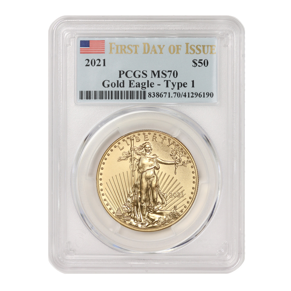 2021 $50 Gold Eagle T1 PCGS MS70 FDOI Flag Label
