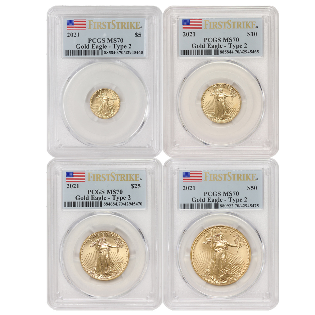 Set of 4 2021 Gold Eagle T2 PCGS MS70 FS Flag Label