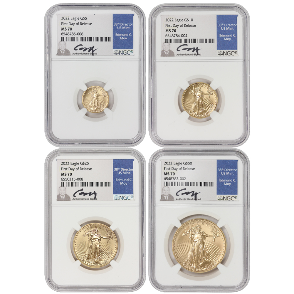 Set of 4 2022 Gold Eagle NGC MS70 FDOI Moy Label